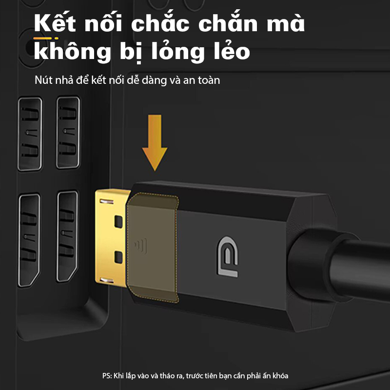 Đầu cắm DisplayPort của AD029 được thiết kế bấm nút khóa cơ học, giúp kết nối chặt chẽ với cổng máy tính, hạn chế tối đa tình trạng rơi rớt, lỏng lẻo khi di chuyển hoặc trong quá trình sử dụng. Đầu cắm còn được chèn mạ vàng chống oxy hóa, tăng cường độ dẫn điện và kéo dài tuổi thọ sản phẩm.