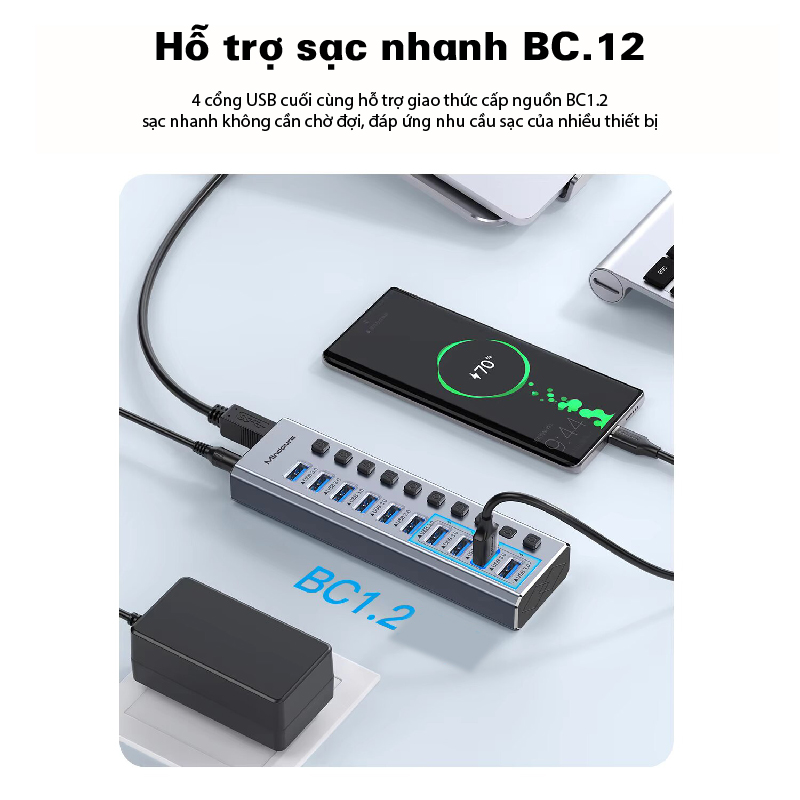 Mỗi cổng trên bộ chia Mindpure US030 đều được trang bị công tắc độc lập, giúp người dùng dễ dàng kiểm soát hoạt động của từng thiết bị kết nối. Đặc biệt, 4 cổng cuối hỗ trợ sạc nhanh BC1.2, cho phép vừa truyền dữ liệu vừa sạc thiết bị, gia tăng độ linh hoạt khi sử dụng.