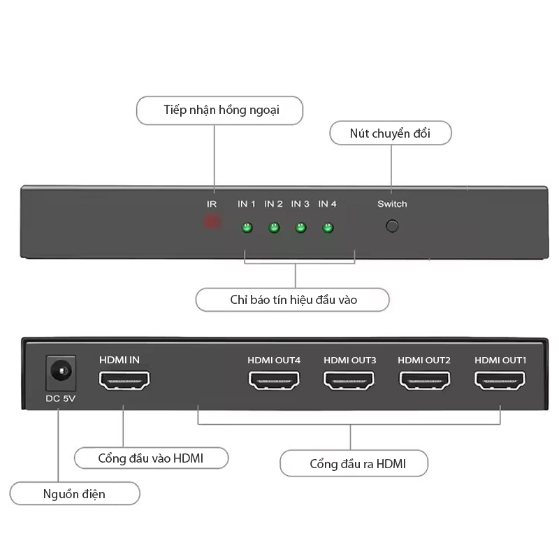 | Cổng kết nối | 1 cổng HDMI vào + 4 cổng HDMI ra |