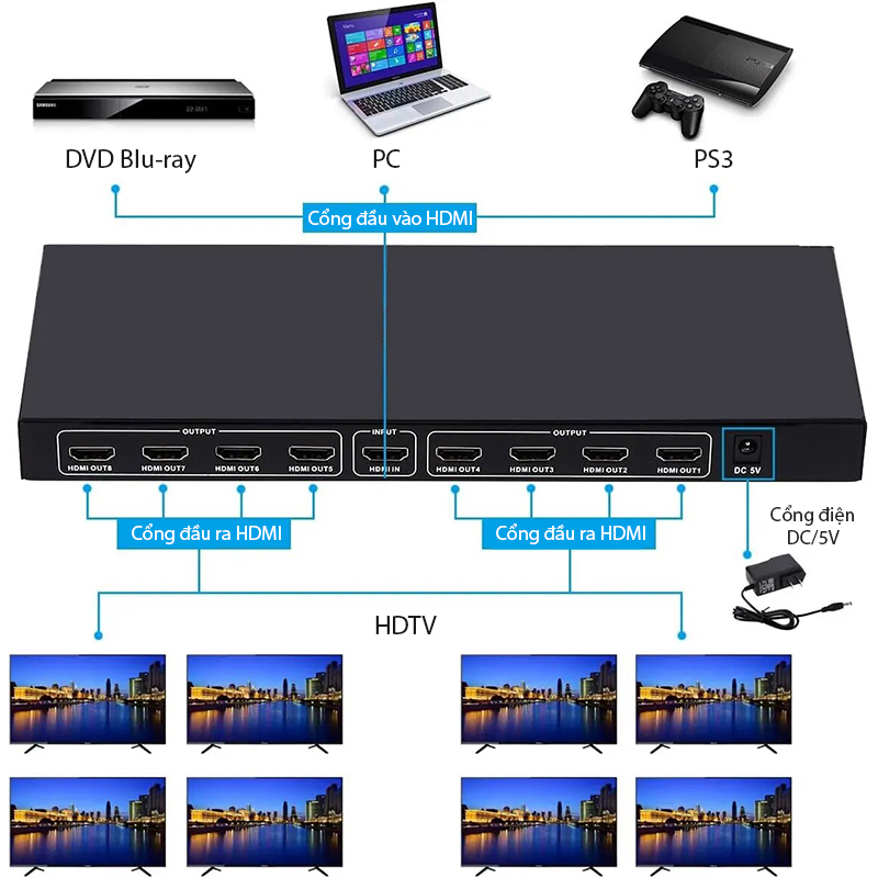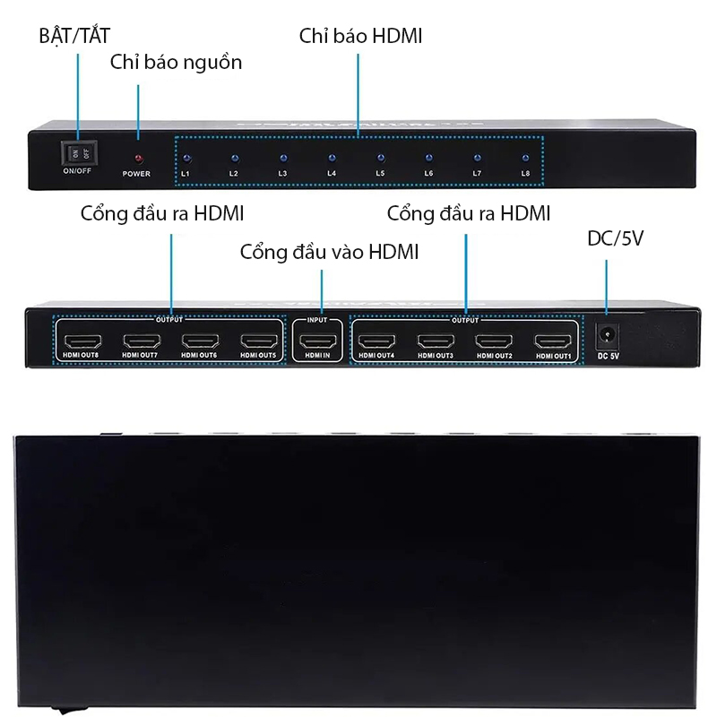 | Cổng kết nối | 1 cổng HDMI vào + 8 cổng HDMI ra |