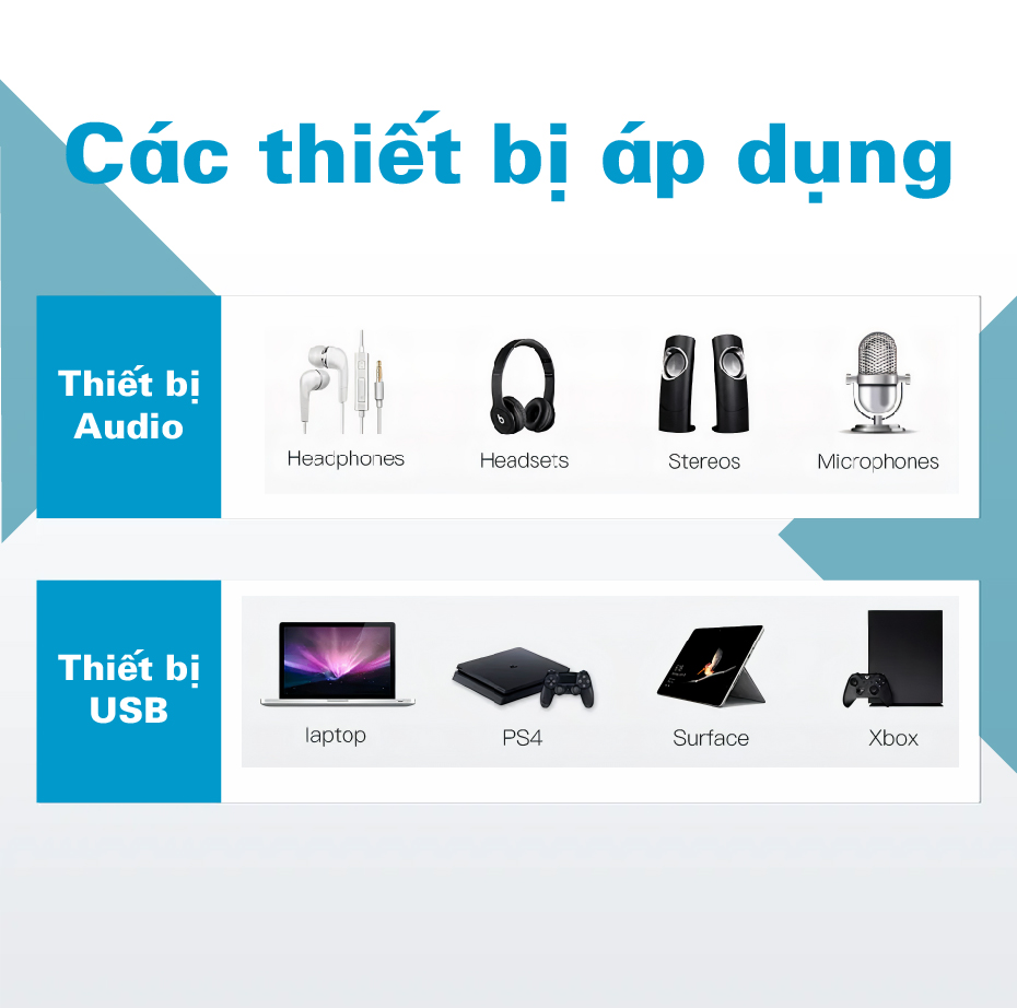 - Đầu ra hai lỗ USB sang tai nghe/micrô, tương thích rộng rãi với các thiết bị USB, PS5, Surface, máy tính xách tay, máy tính để bàn và tất cả các loại thiết bị âm thanh, tai nghe, tai nghe nhét tai, âm thanh nổi, micrô và cáp âm thanh.