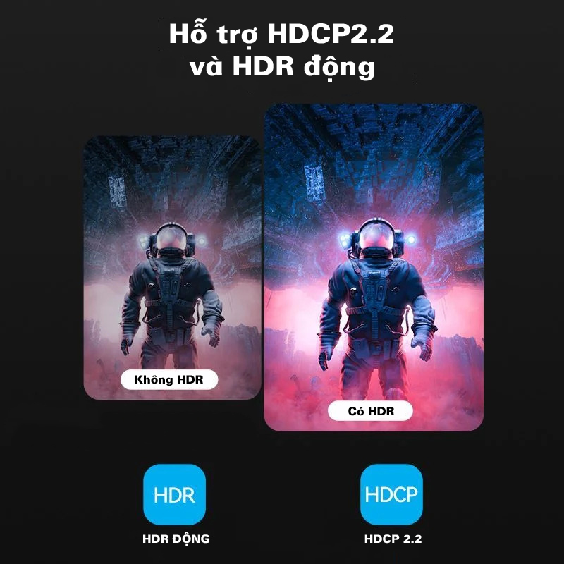 Sản phẩm hỗ trợ HDCP2.2, cho phép phát nội dung có bản quyền từ Netflix, Disney+, Amazon Prime Video mà không gặp lỗi bảo vệ bản quyền. Đồng thời, công nghệ HDR động giúp hiển thị hình ảnh với độ tương phản cao hơn, màu sắc chân thực hơn, tối ưu hóa trải nghiệm xem trên các màn hình hiện đại.