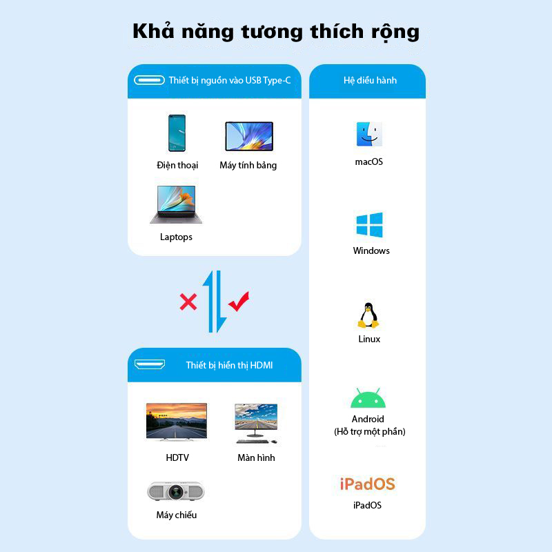 Không cần cài đặt trình điều khiển, chỉ cần kết nối và sử dụng ngay lập tức. Bộ chuyển đổi tương thích với nhiều thiết bị như MacBook, iPad, laptop Windows, smartphone, máy tính bảng và các thiết bị có cổng USB-C hỗ trợ xuất video.