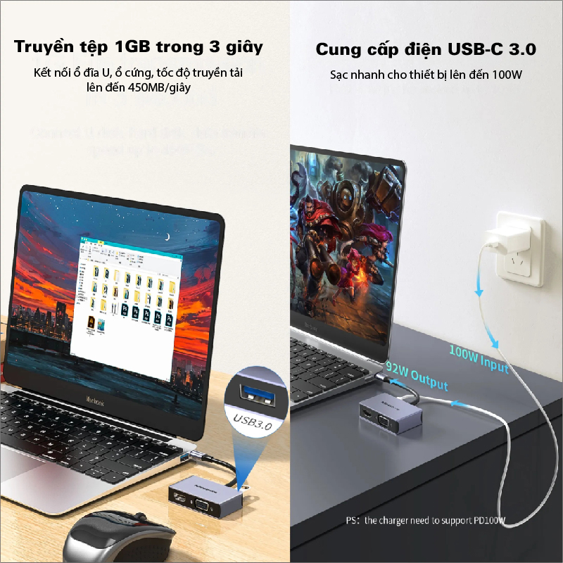 - Loại giao diện: Nguồn điện Type C/HDMI+VGA+USB3.0+ nguồn điện sạc nhanh
