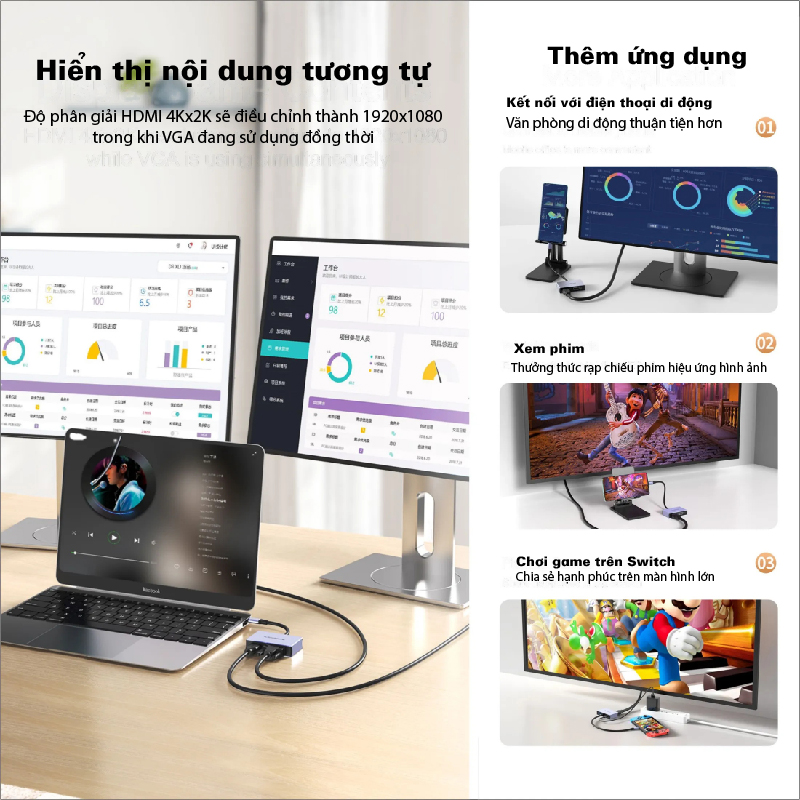 VGA 1080P 60Hz: Hỗ trợ độ phân giải 1920x1080P, giúp kết nối với các thiết bị cũ hoặc màn hình không hỗ trợ HDMI mà vẫn đảm bảo chất lượng hình ảnh tốt.