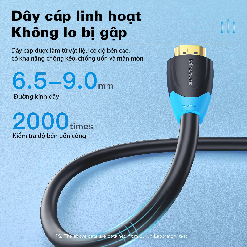Cáp HDMI Mindpure HD001 được thiết kế bền ngoài bằng nhựa PVC chất lượng cao, bảo vệ môi trường và linh hoạt. Điều này giúp cáp dễ dàng uốn cong, không bị gãy gấp khi sử dụng trong thời gian dài.