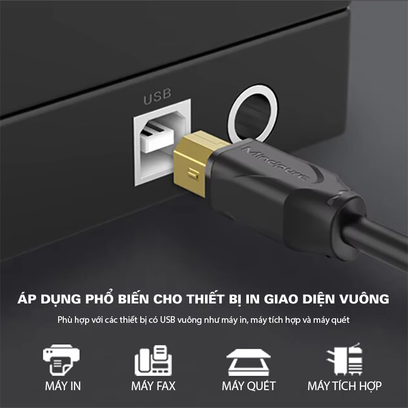 Mindpure US006 hỗ trợ tính năng cắm và chạy (Plug & Play), không cần cài đặt trình điều khiển, giúp tiết kiệm thời gian và công sức khi thiết lập kết nối. Cổng USB vuông của cáp tương thích với hầu hết các máy in và các thiết bị in ấn khác, mang lại sự thuận tiện tối đa cho người sử dụng.