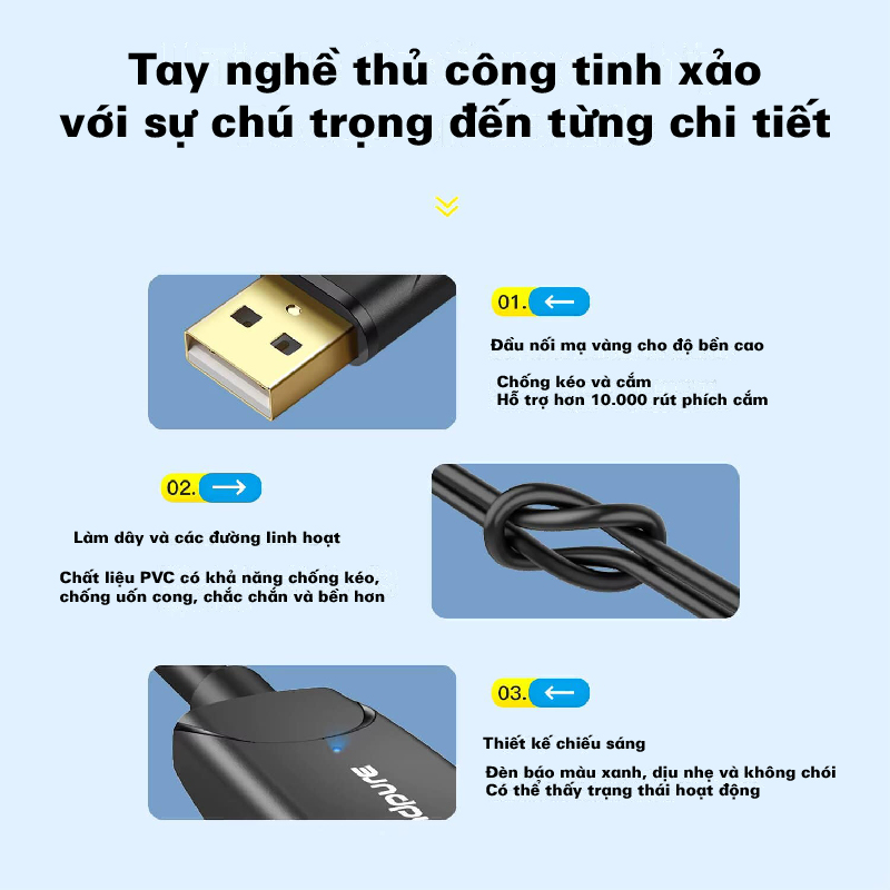 Đầu kết nối được mạ vàng nhằm chống oxy hóa, giảm trở kháng tiếp xúc và duy trì kết nối ổn định trong thời gian dài. Thiết kế này cũng giúp hạn chế tình trạng lỏng lẻo hoặc gỉ sét – một trong những nguyên nhân phổ biến gây ra lỗi kết nối USB.