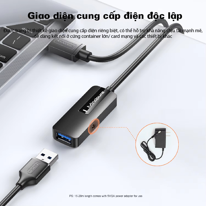Với các phiên bản dài từ 15 đến 20 mét, sản phẩm được trang bị bộ đổi nguồn 5V2A đi kèm, giúp cấp điện ổn định cho các thiết bị sử dụng USB 3.0 và đảm bảo hoạt động trơn tru của chip khuếch đại trong quá trình truyền tải dữ liệu.