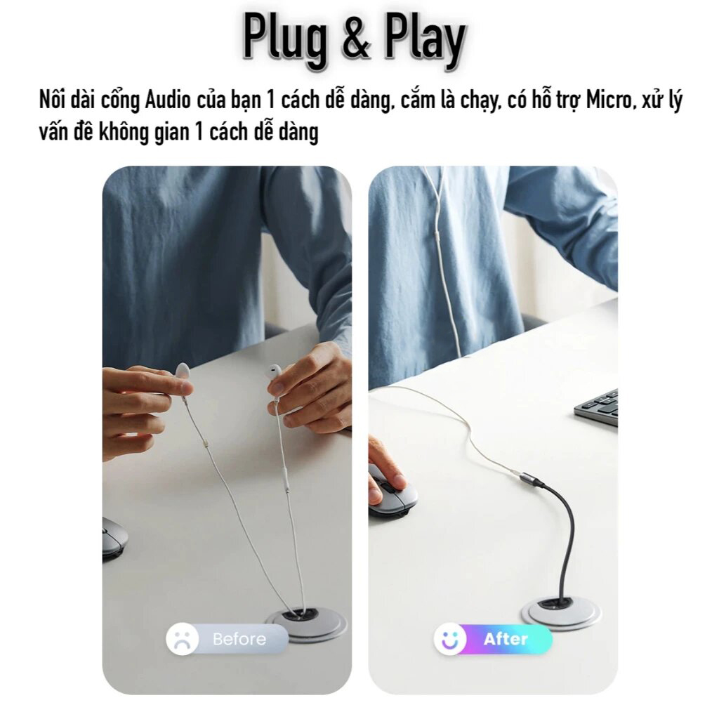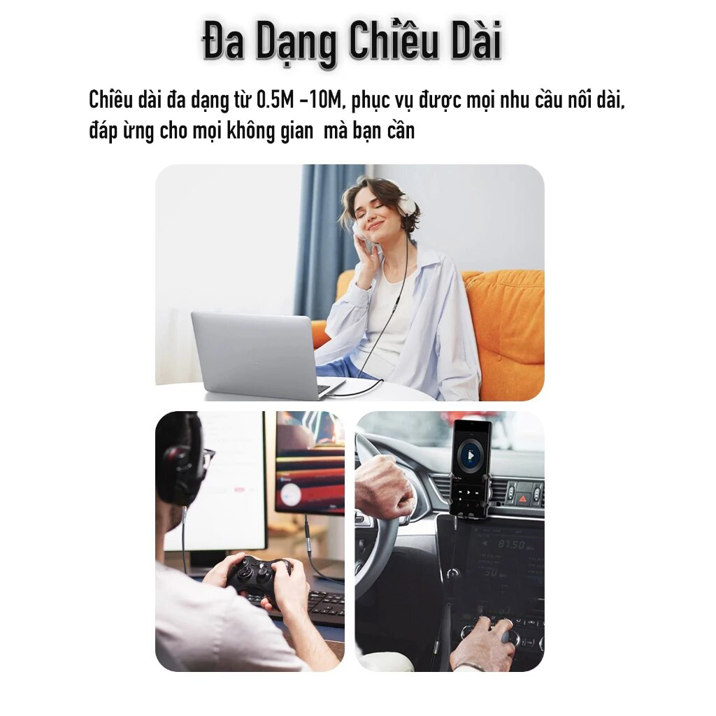 Cáp nối dài giúp bạn linh hoạt hơn khi thiết lập không gian giải trí, làm việc hoặc trình chiếu. Không còn bị giới hạn bởi chiều dài của cáp tai nghe, loa hay thiết bị phát — giờ đây bạn có thể thoải mái ngồi xa thiết bị mà vẫn giữ được kết nối ổn định.