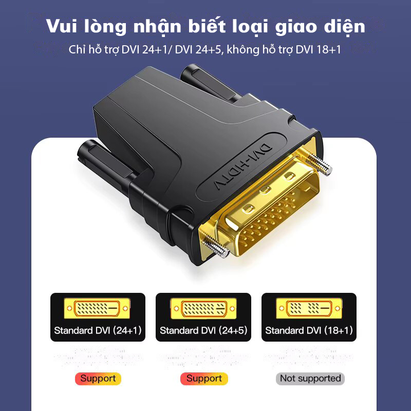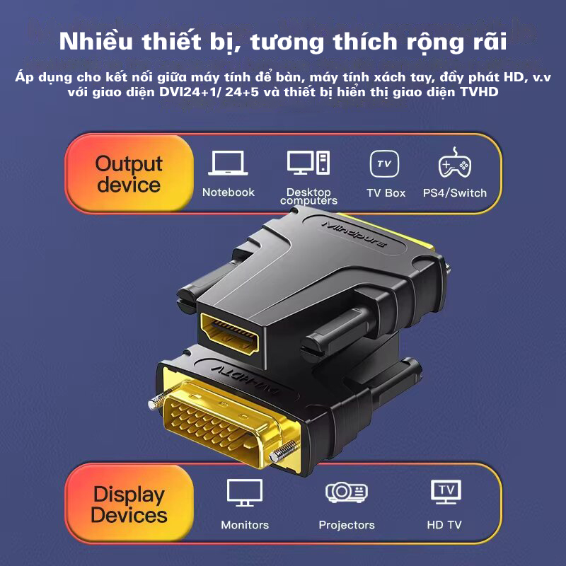 AD049 cung cấp giao diện DVI 24+1 (đực) sang HDMI (cái) và ngược lại, cho phép bạn sử dụng nó để kết nối hai thiết bị có các chuẩn cổng khác nhau mà không gặp phải bất kỳ sự cố nào. Tính linh hoạt này giúp dễ dàng kết nối các thiết bị như máy tính, màn hình, máy chiếu, TV và nhiều thiết bị khác.